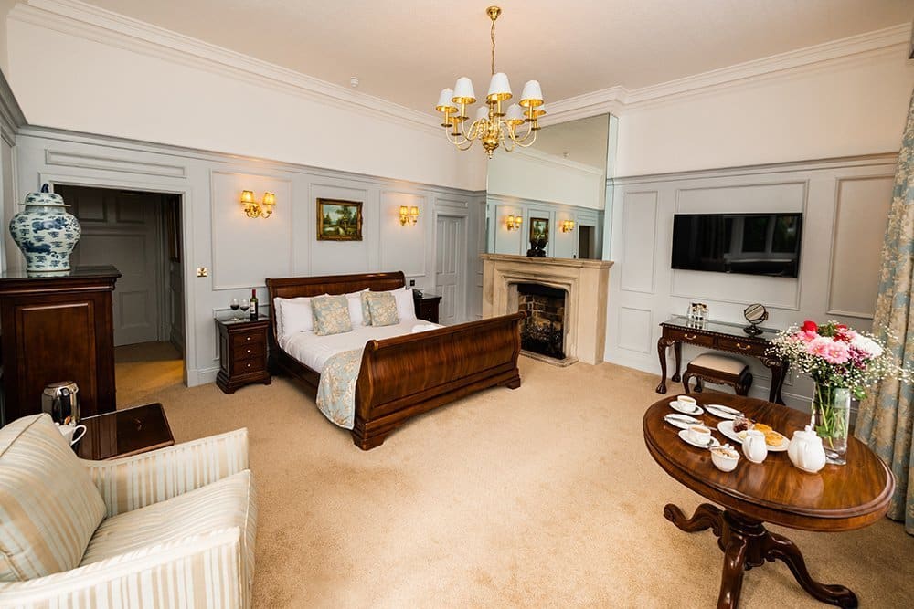 The room has a Super King bed plus seating area with two arm chairs arranged around the fireplace.