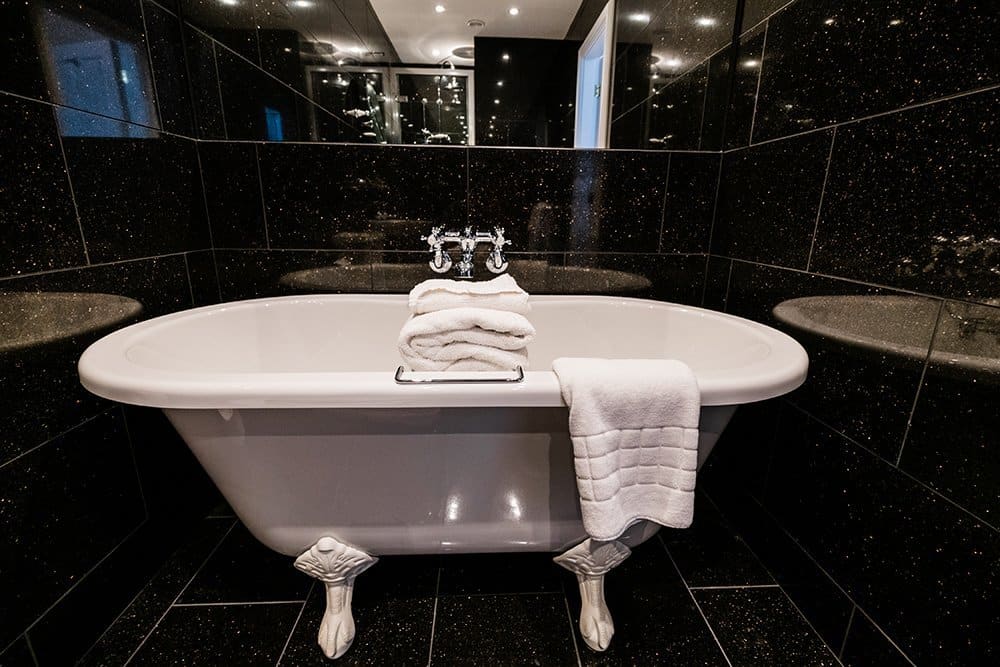 Decor is contemporary classic, walls are painted wooden panelling, finished in a light grey pallet. Featuring a king size Venetian Four Poster bed with free standing double ended bathtub ‘in-room’ it also incorporates a separate double sized shower cubicle in black granite.